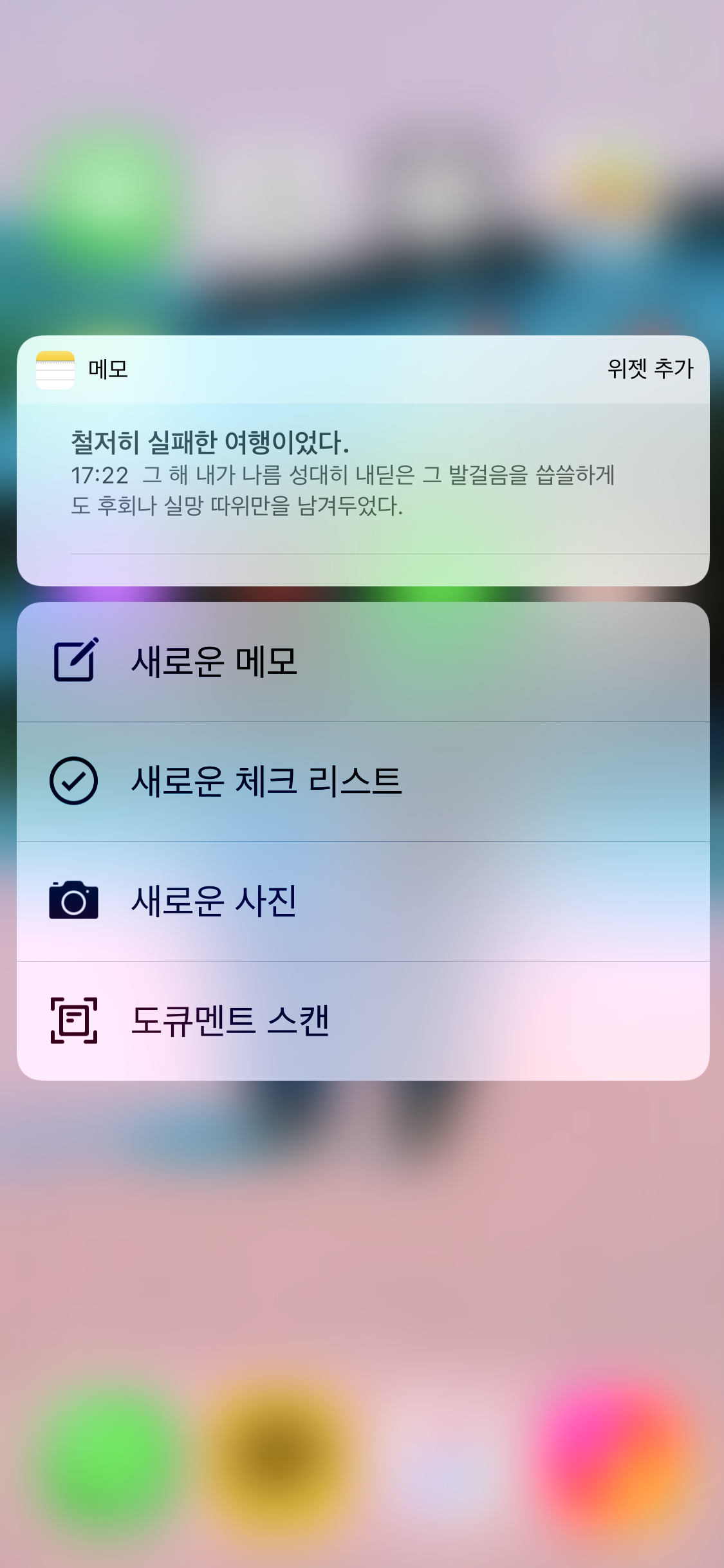 그래서인지 롱프레스가 원래하던 역할인 앱 재정렬이 3D터치 시 등장하게 되었다. 3D터치가 없는 기기의 유저가 롱프레스를 했을 때 위젯반응 위한 입력이었는지 앱 재정렬을 위한 입력이었는지 모호한 경우가 발생할 것에 대한 대책인 듯 보인다.