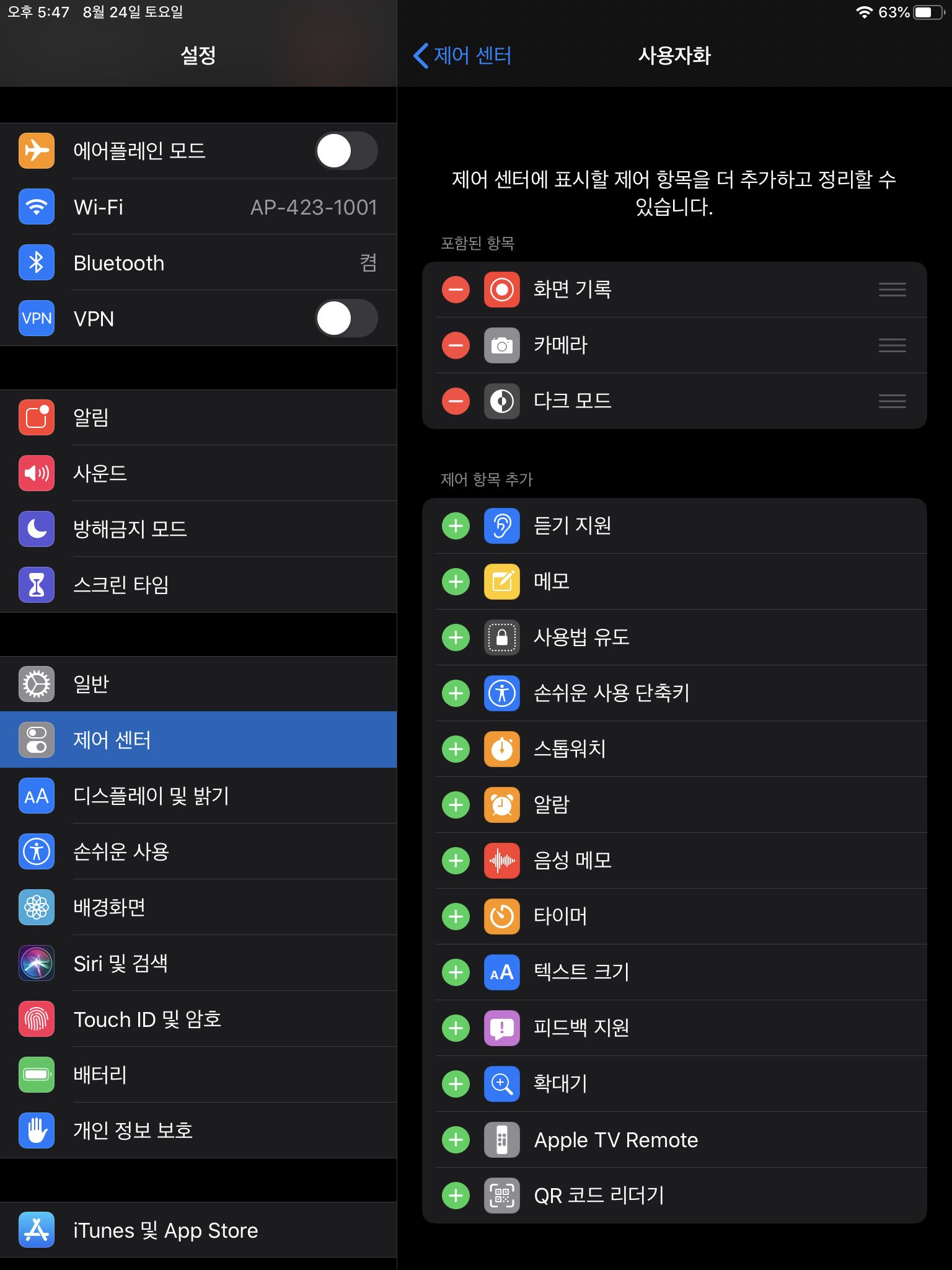 제어센터는 조금 더 멋있어졌다. 이제 와이파이와 블루투스 연결을 제어센터에서 변경할 수 있다. 3D터치를 이용하면 된다. 어? 아이패드는 3D터치가 안 되는데? iOS13부터는 3D터치가 없는 기기들에서 롱프레스(길게 누르는 것)를 3D터치와 같은 효과를 낼 수 있도록 입력받는다.