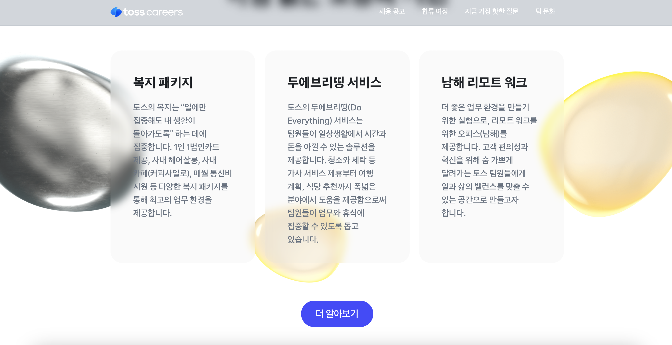 최근 토스의 행보 한 발 한 발이 눈에 띄어 이제 무슨 사업을 진행하려나, 어떤 방식으로 진행하려나 하는 마음으로(절대 딴맘있어서가 아닙니다 대표님) 대규모 공채 사이트에 들어갔다. 역시나의 유려한 디자인과 사용자 경험에 늘 그렇듯 감탄 한 번 해주고선 나머지를 쭉 읽어나가던 중 이전에 보지못했던 남해 워케이션 지원이라는 직원 복지제도가 눈에 띄었다. 아니 나도 모르는 사이에 대체 남해에 무슨일이 있는 건가 하고 당장 남해군청에 들어가봐도 큰 힌트를 찾을 수는 없었지만 구글에 워케이션하고 딱 치니 지그재그, 카카오 등의 기업도 남해를 포함한 여러 도시에서 워케이션을 시도하고 있는 흔적들을 쉽게 볼 수 있었다. 생각해보니 얼마전에 EO에서도 양양에서 몇몇 스타트업 대표들을 모아두고 워케이션 리얼리티 프로그램을 진행했던 것이 막연한 스타트업 낭만 부풀리기가 아니라 현재하는 트랜드였음을 꽤나 빠르게 또 꽤나 느리게도 알아차린 것이다. 물론 네이버와 카카오에 다니는 형누나들이 전면 리모트 근무로 집에서들 잘 근무하는 것을 보았으나 종종 본사에 소환되어야 하는 일이 있든지 그게 아니더라도 서울을 쉽게 떠날 수 없는 여러 제약 조건들이 약간은 아쉽기 마련이었다. 그래서 더 대담하고 더 구체적인 방안이 마련되길 바랬다. 한편으론 그럼에도 대담한 시도를 하는 몇몇 기업들의 행보가 대단하고 고마웠다.