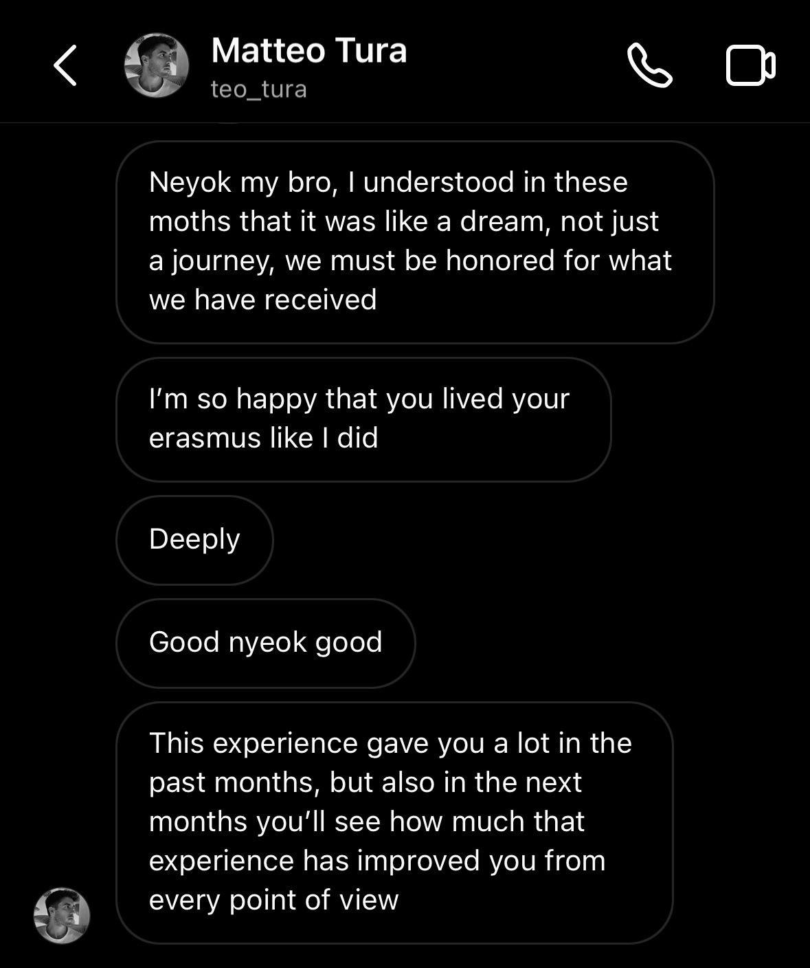 결론적으로 우리는 그 마지막 3주 내내 많은 것들을 나눴다. 그와 나눴던 대화가 어떻게 보면 내 교환학생 생활 전체에 대한 방향을 잡아줬다고 생각될 정도로, 마테오가 나누어 준 교환학생에 대한 자신의 관점과 자신이 처음부터 알았으면 좋았을 것들 혹은 태도 그 모든 것들이 참 고마웠다. 이후에도 마테오는 내가 인스타그램에 올리는 스토리들을 보며 쉬지않고 즐기는 데에 힘부치지 않도록 북돋아 주거느 종종 연락하여 일상을 나누기도 또 내가 고민인 지점들에 조언을 해주기도 했다.
