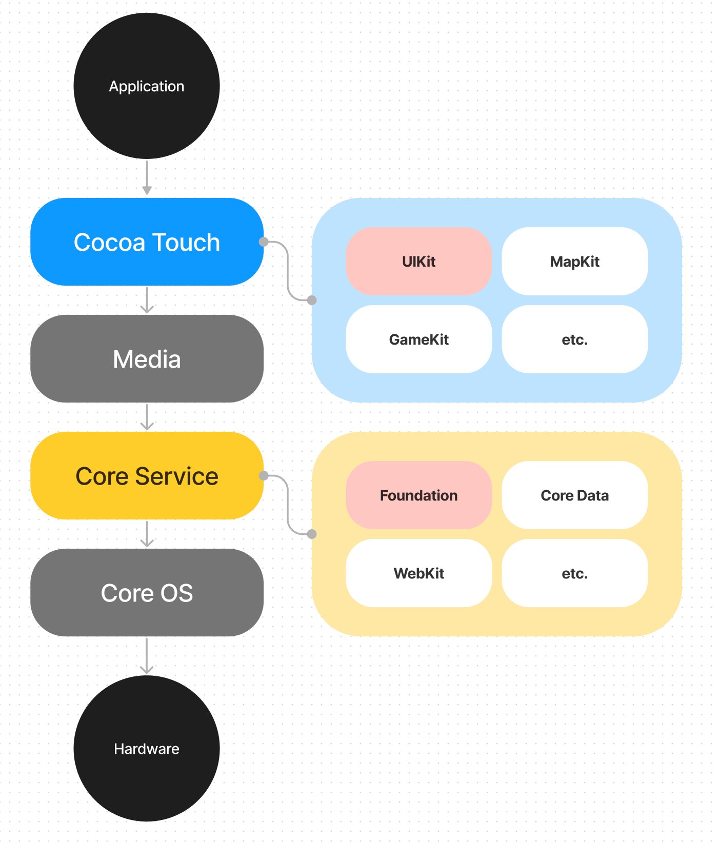 이걸 이해하려면 먼저 아래 iOS의 프레임워크 구조부터 이해해야한다.