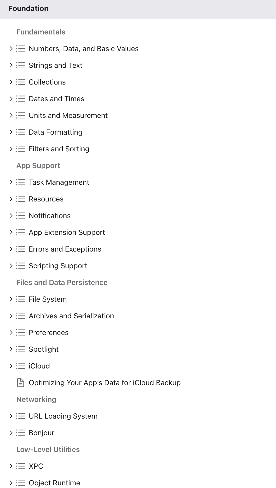 Foundation을 애플 개발자 공식문서에서 찾아보면 아래처럼 보다 광범위한 것들을 다루고 있는 것을 확인할 수 있는데,